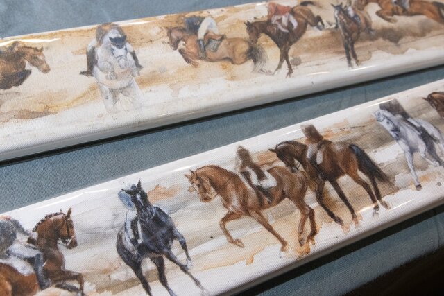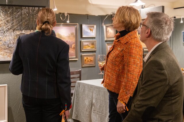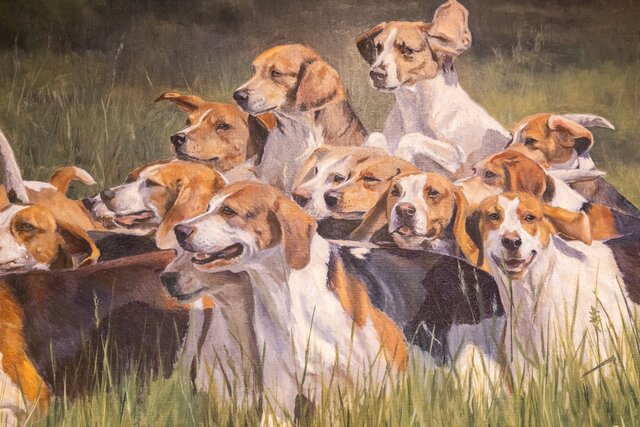 Manche Gemälde wollen mit einem Augenzwinkern betrachtet werden. Dazu zählen der Jagdhund auf dem Sofa und der das Wildschwein jagende Jack Russell.