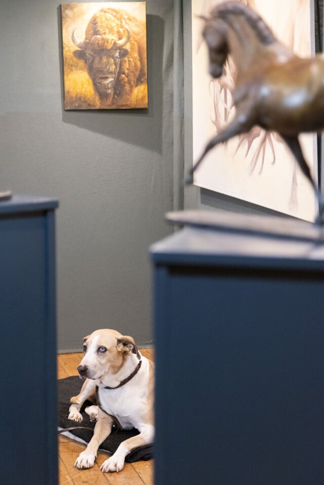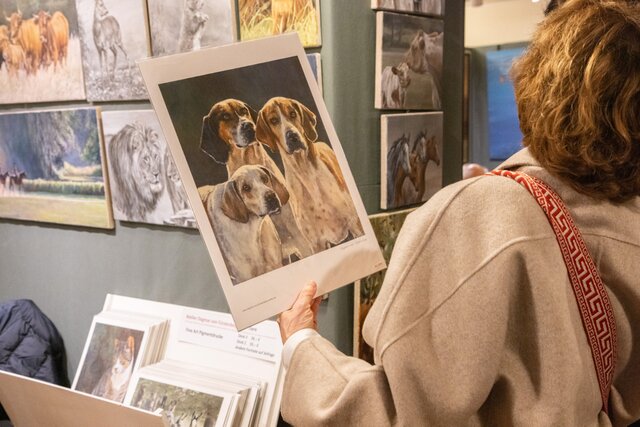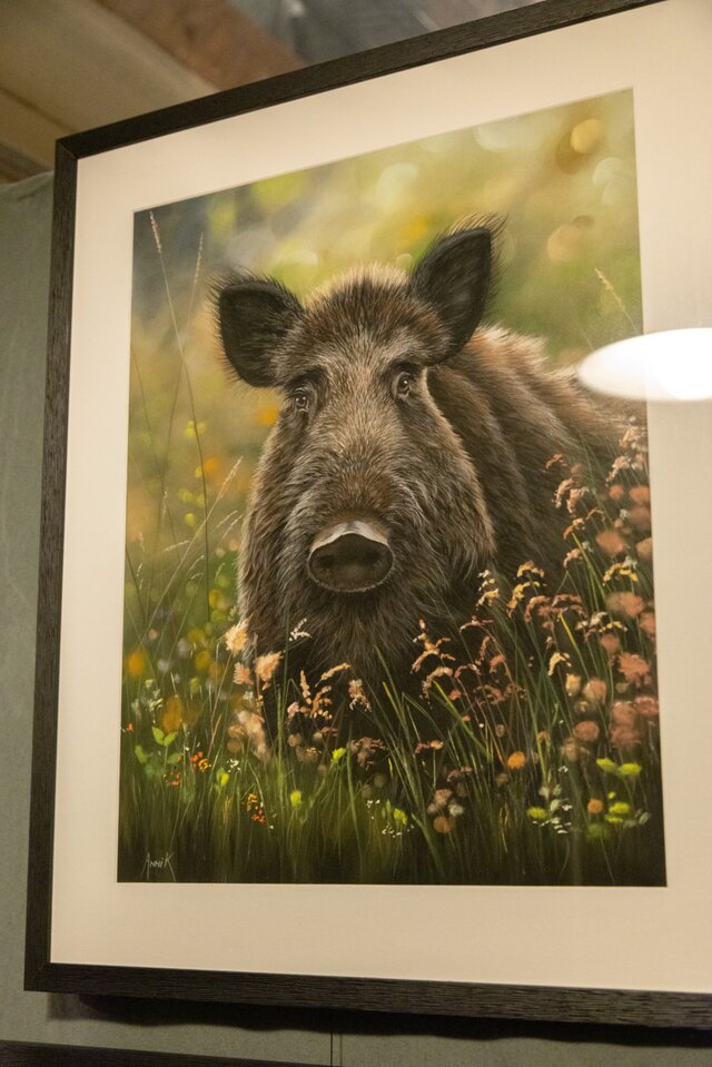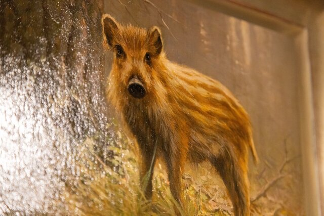 Manche Gemälde wollen mit einem Augenzwinkern betrachtet werden. Dazu zählen der Jagdhund auf dem Sofa und der das Wildschwein jagende Jack Russell.